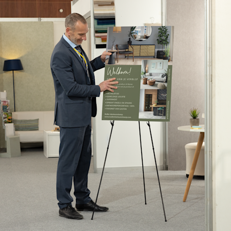 Ja, je kunt je reclameborden aanpassen door je eigen ontwerp te uploaden of een van onze aanpasbare sjablonen te gebruiken. Andere mogelijke aanpassingsopties zijn bijvoorbeeld het type materiaal en enkel- of dubbelzijdige bedrukking. Bevestigingsaccessoires kunnen niet aangepast worden.
