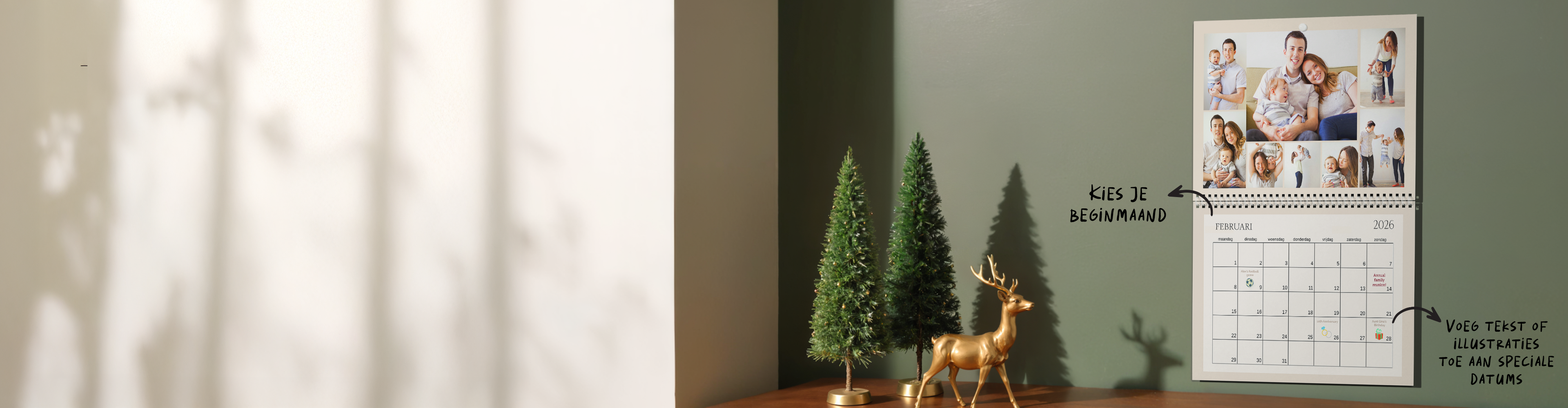 Ja! Tijdens het ontwerpproces kun je speciale datums toevoegen, zoals verjaardagen, jubileums en nog veel meer. Tijdens het ontwerpen kun je ook decoraties aan je unieke kalender toevoegen. We hebben clipart die je kunt toevoegen waar je maar wilt. Je kunt ook de feestdagen aanpassen en andere datums bewerken die je op de kalender wilt weergeven (of juist niet!), zoals Valentijnsdag of Moederdag.