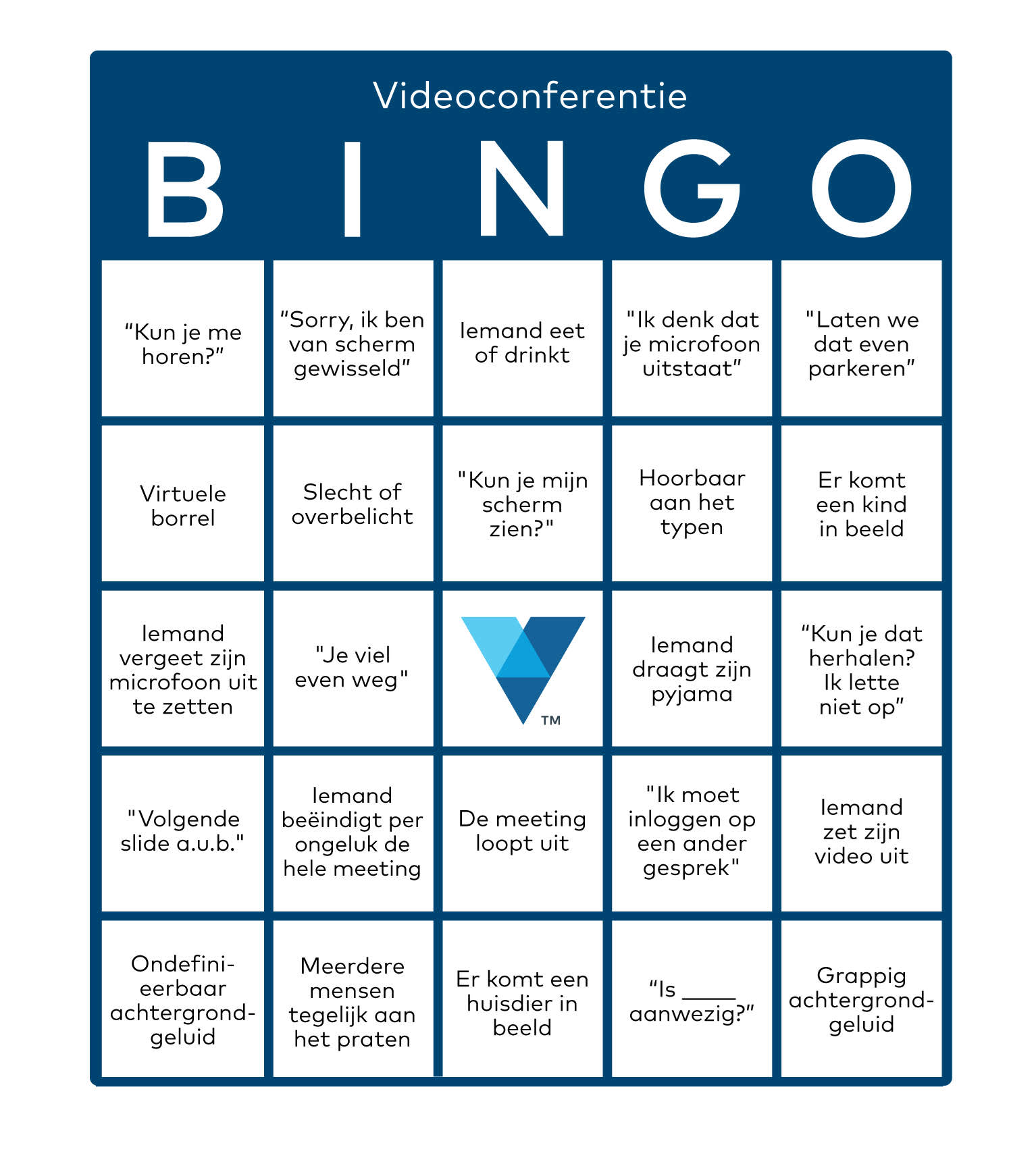 Een leuke manier om een band met collega’s op te bouwen, is een online bingo. Vooral tijdens dagelijkse videoconferenties. Maak een bingokaart met veelvoorkomende thema’s en zinnen die met werk te maken hebben en streep ze door als ze zich voordoen. Een paar van onze favorieten: als iemand zegt “kun je me horen?” of “er liep een huisdier of een gezinslid in beeld”. Klik hier om de jouwe te downloaden en thuis te spelen.