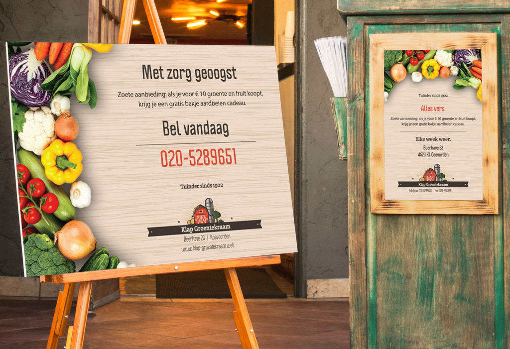 Als je het groter wilt aanpakken, zijn posters en spandoeken een duurzame, opvallende optie die van ver te zien is. Plaats ze buiten voor de deur van je winkel om nieuwe klanten aan te trekken en hang ze strategisch op in je winkel om klanten te begeleiden en te informeren. Gebruik opvallende teksten en heldere afbeeldingen om zoveel mogelijk aandacht te trekken.