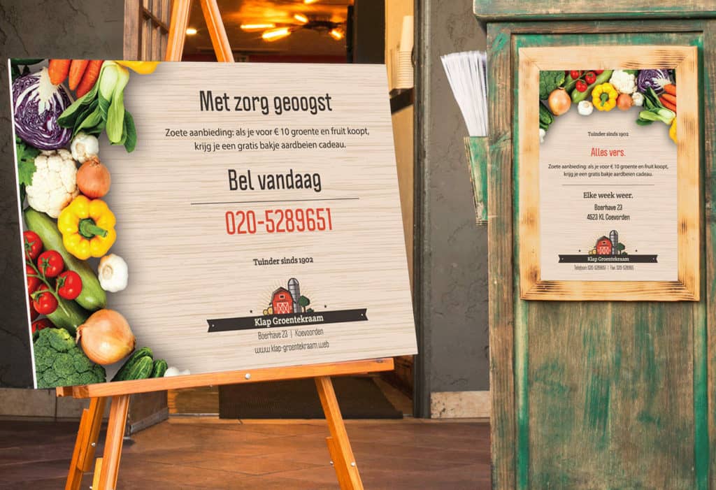 Met folders, informatiekaarten en flyers kun je meer gedetailleerde informatie geven over je bedrijf. Gebruik foto’s met hoge resolutie en duidelijke, beknopte teksten om potentiële klanten alles te vertellen wat ze willen weten. Dit marketingmateriaal biedt ook veel ruimte om prijzen, overzichten van diensten en menu’s op te nemen.