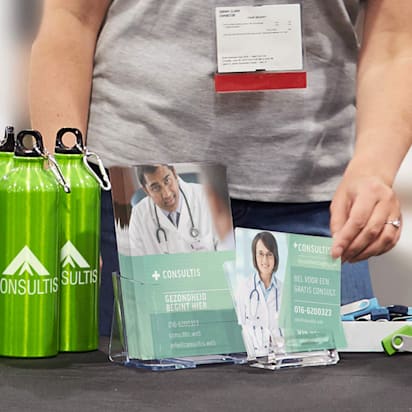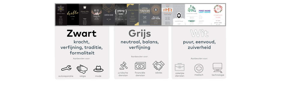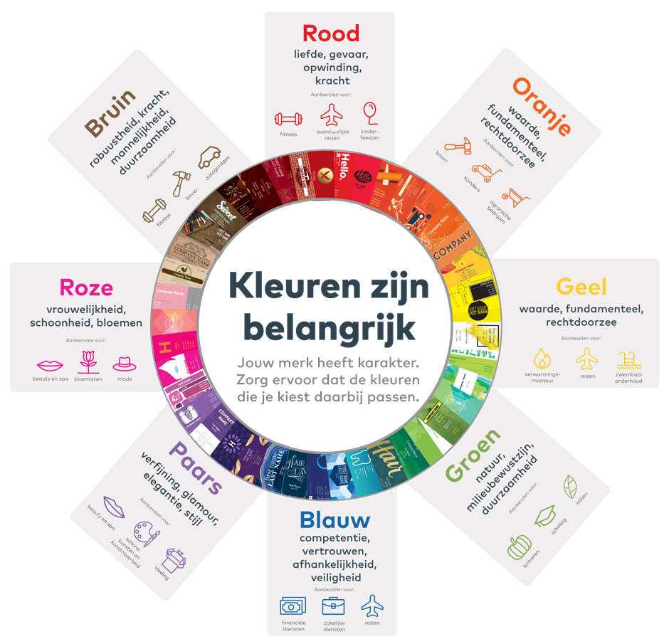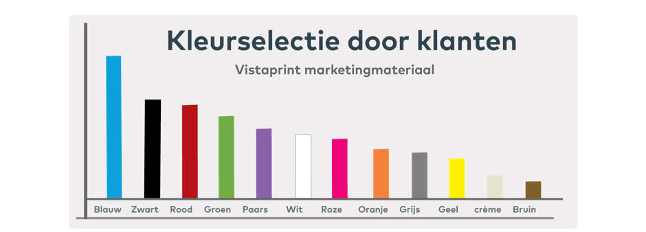 We hebben ook geanalyseerd welke kleuren populair waren bij klanten van Vistaprint die de kleurenfilterknoppen gebruikten terwijl ze marketingmateriaal zochten op onze site. Op basis van de gepresenteerde informatie is het nu aan jou om te besluiten of je kiest voor een kleur die meestal geassocieerd wordt met jouw bedrijfstak of dat je juist je eigen weg gaat en een minder traditionele kleur kiest om op te vallen tussen je concurrenten.