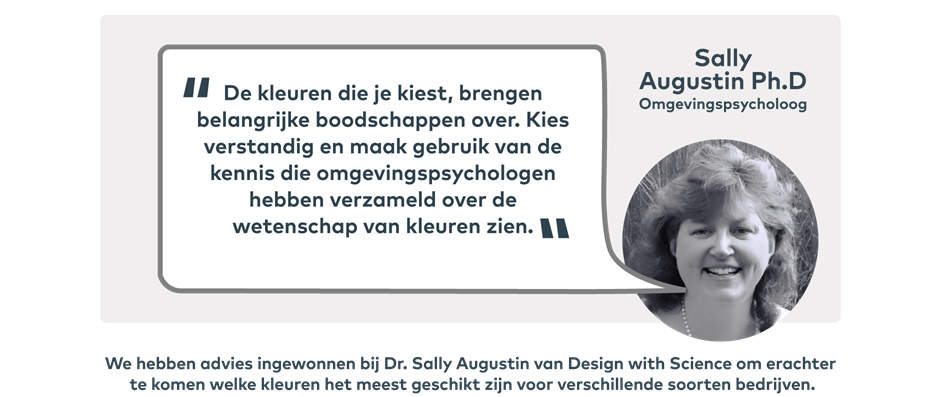 We hebben samengewerkt met Dr. Sally Augustin van Design With Color. Zij heeft veel ervaring met het gebruiken van wetenschappelijke inzichten om merken te adviseren bij het ontwerpen van ruimtes, voorwerpen en diensten die de gewenste cognitieve, emotionele en fysieke belevingen teweeg brengen. Tot de klanten van haar bedrijf behoren fabrikanten, dienstverleners en ontwerpbureaus in Noord-Amerika, Europa en Azië. Sally’s werk is besproken in diverse kranten en tijdschriften, zoals de New York Times, de Wall Street Journal, de Guardian, Forbes en Psychology Today.