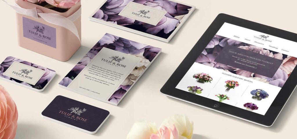 Waar mensen ook in contact komen met je bedrijf, het moet herkenbaar zijn. Een consistente look kan klanten helpen de link te leggen tussen je online en offline identiteit. Offline materiaal als visitekaartjes, postkaarten en stickers helpen klanten (en in dit geval ontvangers van de boeketten!) je merk onthouden. Online kun je de kleuren van je merk versterken met stock-foto’s die je kunt kopen op websites met fotodeeldiensten, of met foto’s van je eigen producten. Hier gebruikt Tulp & Roos een foto die van dichtbij is genomen van een paars boeket als afbeelding voor de websiteheader. Verder naar beneden op de pagina worden producten getoond die bij de merkkleuren passen.