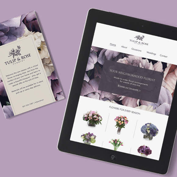 Een makkelijk te onthouden, herkenbaar logo is essentieel voor het opbouwen van een merk dat klanten bijblijft. Denk tijdens het ontwerpen van je logo aan alle verschillende elementen waar het op gebruikt zal worden en zorg dat het overal werkt. Hier gebruikt Tulp & Roos een vrij duidelijk logo dat er goed uitziet op al hun marketingmateriaal: eenvoudige, stijlvolle tekst (inclusief een beschrijving van het soort bedrijf) onder een geïllustreerd boeketmotief. Voor de lettertypen in het logo, Trajan Pro en Prosto, worden schreefloos en schreef gecombineerd voor een opvallende, subtiel contrasterende look die klassiek, elegant en een beetje speels aandoet. Het logo is in een contrasterend kader geplaatst om op te vallen op visitekaartjes en postkaarten, maar is kenmerkend genoeg om op zichzelf te staan als websiteheader of op een sticker.