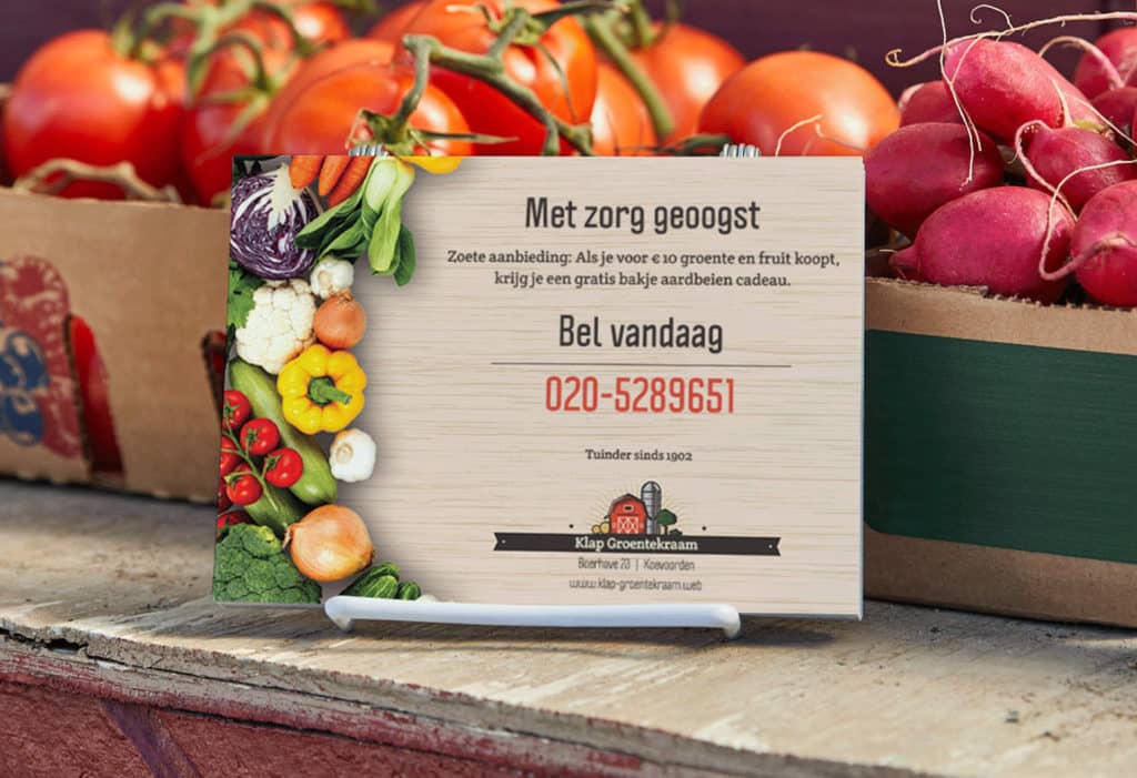Je gedrukte materiaal heeft maar heel even de tijd om de aandacht van je lezer te trekken. Zorg ervoor dat je antwoord geeft op wat de lezer waarschijnlijk denkt: ‘Wat heb ik hieraan?’ Als je net een nieuwe winkel hebt geopend, een nieuw product hebt ontwikkeld of binnenkort uitverkoop of een evenement hebt, zijn postkaarten en flyers de perfecte manier om je boodschap te verspreiden.
