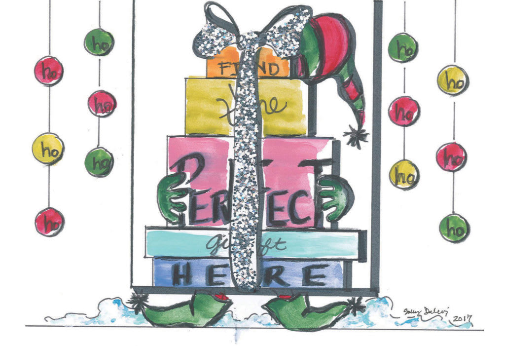 Deze etalage is ontzettend leuk en grappig. De gedrukte pakjes moeten netjes zijn en de heldere kleuren moeten visueel van het bord afspatten. De enorme glitterstrik verbindt het hele concept met elkaar. Het verrassingselement is dat je alleen maar de muts, handen en voeten van de elf ziet. Een klein beetje glittersneeuw aan de onderkant maakt de setting helemaal af, zodat je etalage jong en oud zal intrigeren!