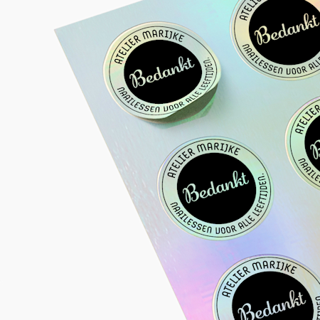 Onze etiketten op vel worden geprint op wit papier, doorzichtig kunststof (polypropyleen) of goud- of zilverkleurig materiaal. Door het full colour drukwerk kun je zo veel (of zo weinig) van de sticker bedrukken als je wilt. Met andere woorden, maximale flexibiliteit voor jouw eigen ontwerpen.